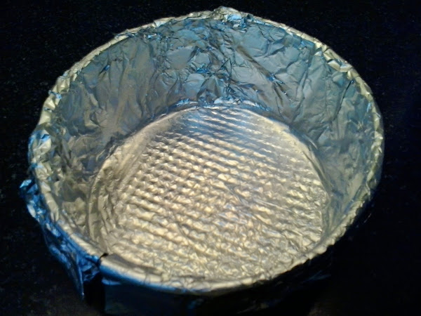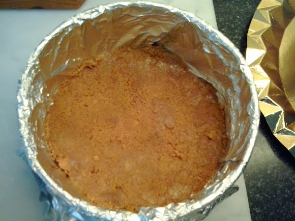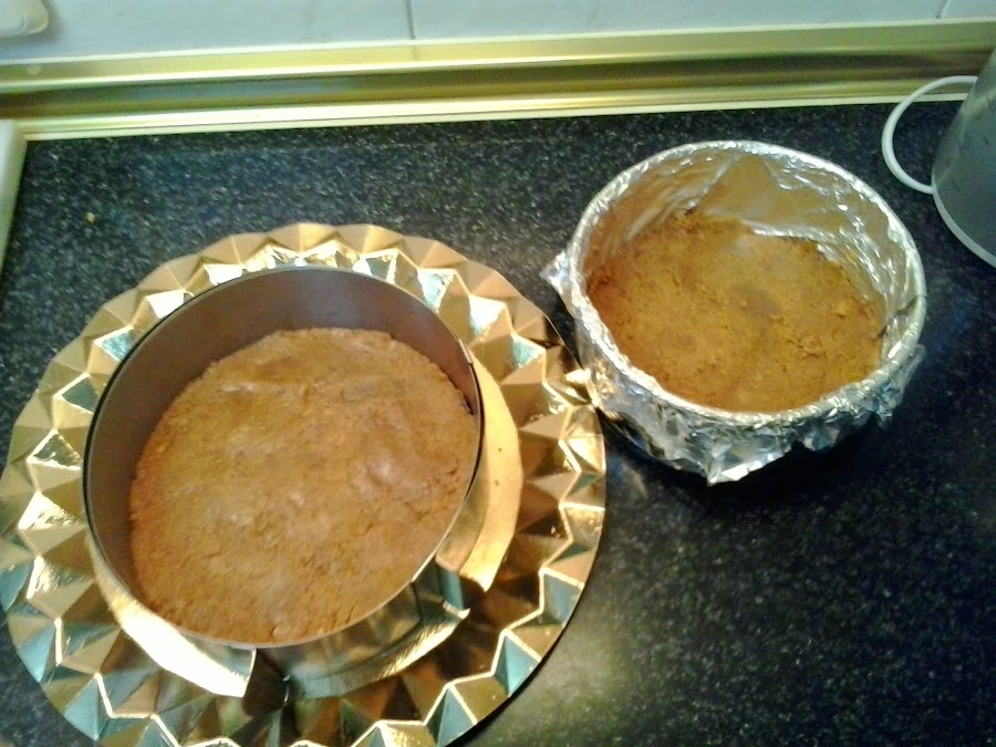 Forramos un molde desmontable con papel de aluminio, o podemos usar también un aro de repostería. Repartimos la masa de la galleta por el fondo de los moldes, apretando bien con el dorso de una cuchara, para que quede bien compacto. Reservamos en el frigorífico.