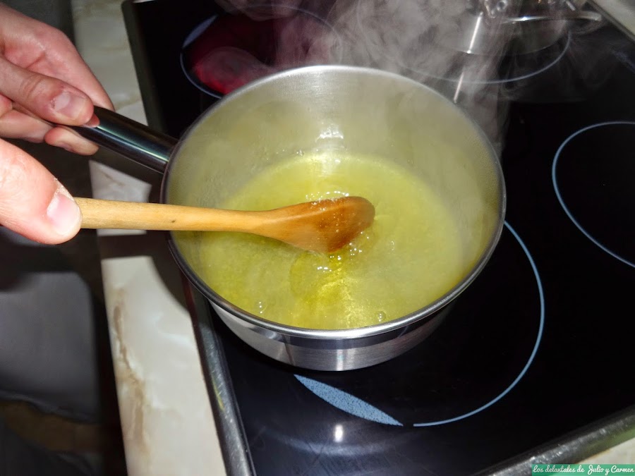 En un cazo, pondremos el zumo de limón con la otra mitad del azúcar y llevaremos a ebullición. Llegados a este punto, echaremos las hojas de gelatina (previamente escurridas del agua) y removeremos para que se disuelvan completamente. Dejaremos templar.