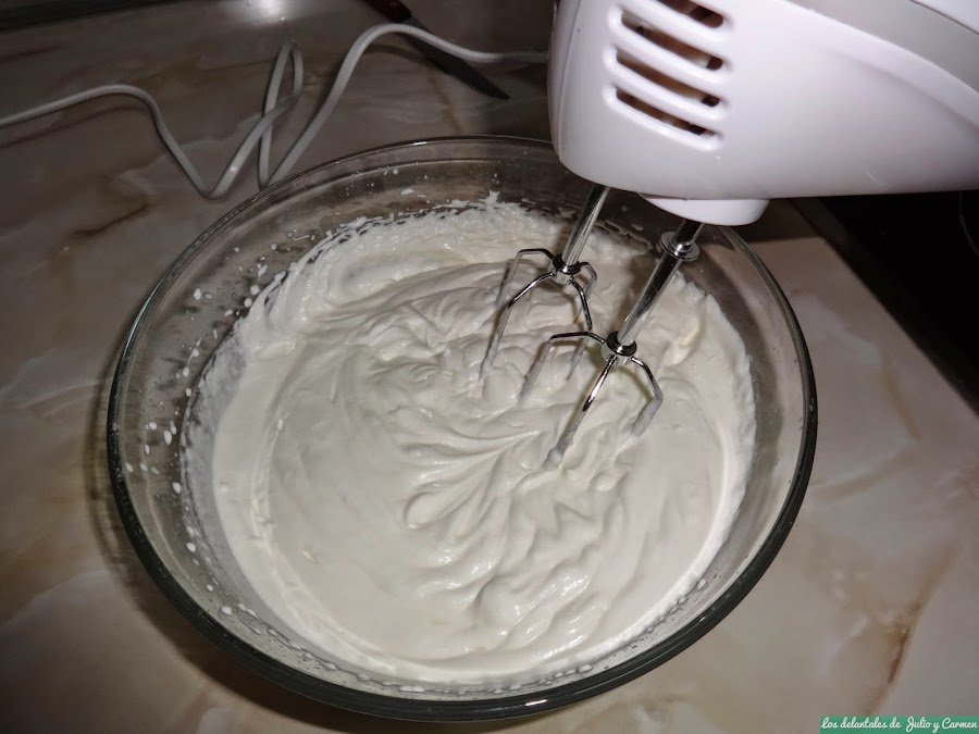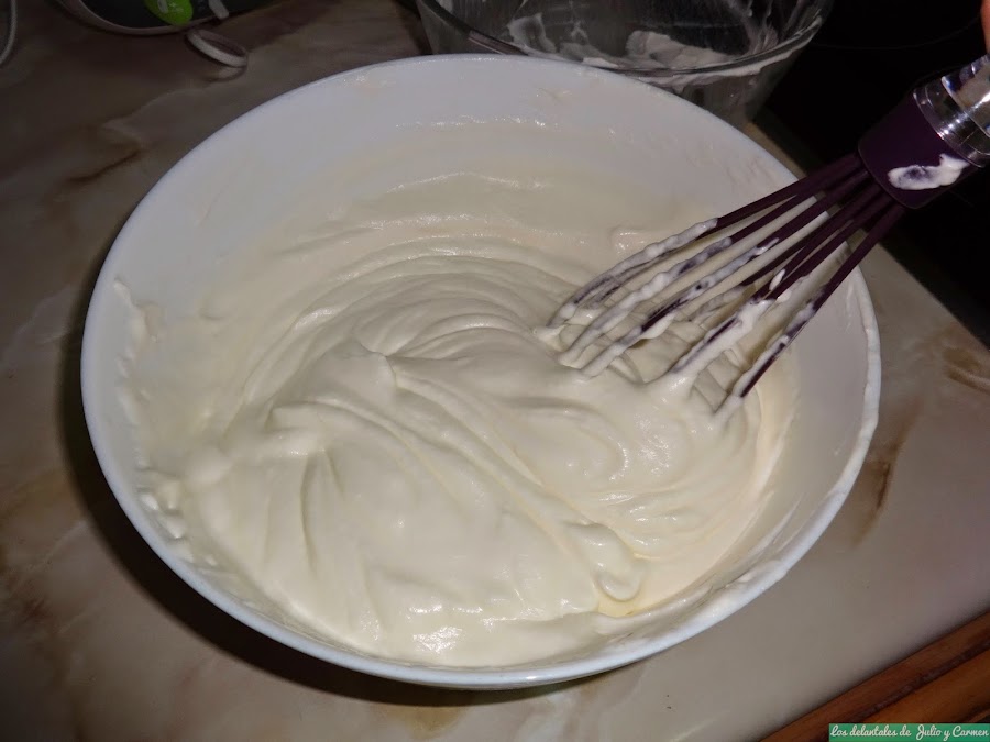 En un bol, montaremos la nata (crema de leche) con la mitad del azúcar (unos 60 gr), teniendo cuidado de no pasarnos al batir y que se corte. Reservamos.
