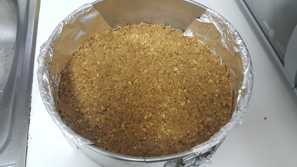 Lo primero que haremos es preparar la base de la tarta. Trituramos las galletas, si tenéis una picadora en un momento lo tendréis listo, si no, como en mi caso, las vamos triturando en un mortero. Calentamos un poco la mantequilla hasta conseguir textura de pomada y la añadimos a las galletas hasta crear una pasta consistente.