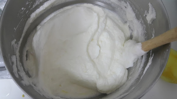 Terminamos el mousse mezclando las claras a punto de nieve con la nata montada (crema de leche). Seguidamente añadimos el zumo de limón con la gelatina atemperado. Hay que mezclar todo muy despacio y con movimiento envolventes. El zumo de limón no pude estar muy caliente ya que nos licuaría lo demás.