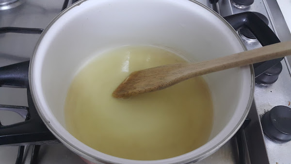 Paralelamente, calentamos el zumo de limón recién exprimido y sin pepitas. Antes de que empiece a hervir, le añadimos las hojas de gelatina previamente hidratadas según envase, removemos hasta que se disuelvan a fuego muy bajo. Dejamos enfriar un poco.