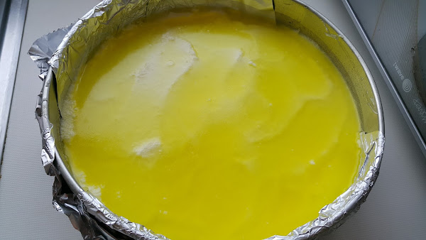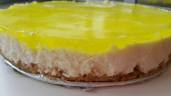 Ya para terminar y darle un toque más curioso preparamos una cobertura. Simplemente es preparar gelatina de limón según las instrucciones del envase, dejarla atemperar un poco y verterla sobre nuestra tarta y nuevamente o congelarla o dejarla de un día para otro en la nevera.