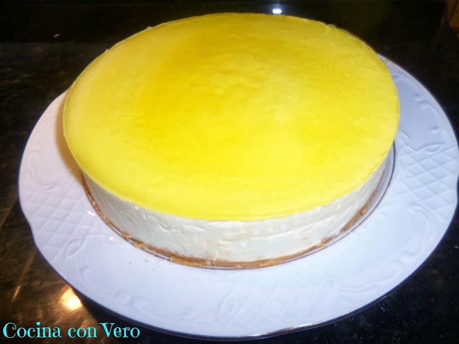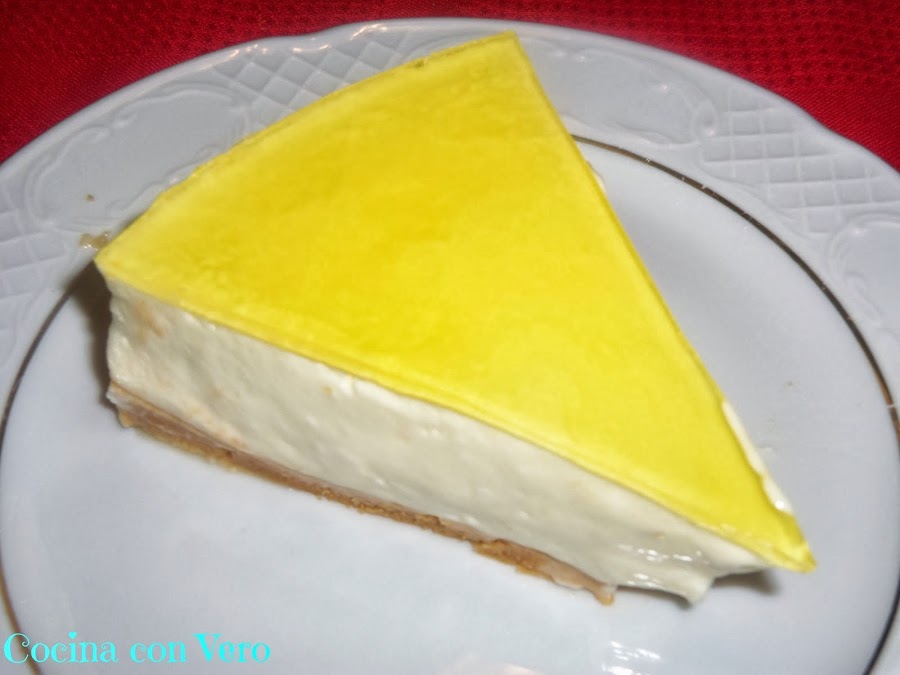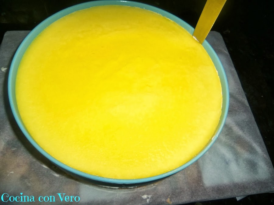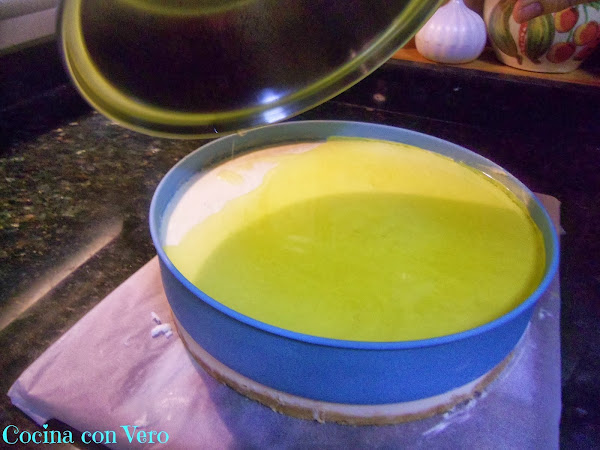 7/ Volcamos la gelatina ya líquida por encima de la tarta, la guardamos en la nevera para que coja de nuevo consistencia y por último la desmoldamos pasándole un cuchillo por los alrededores y la servimos bien fría.