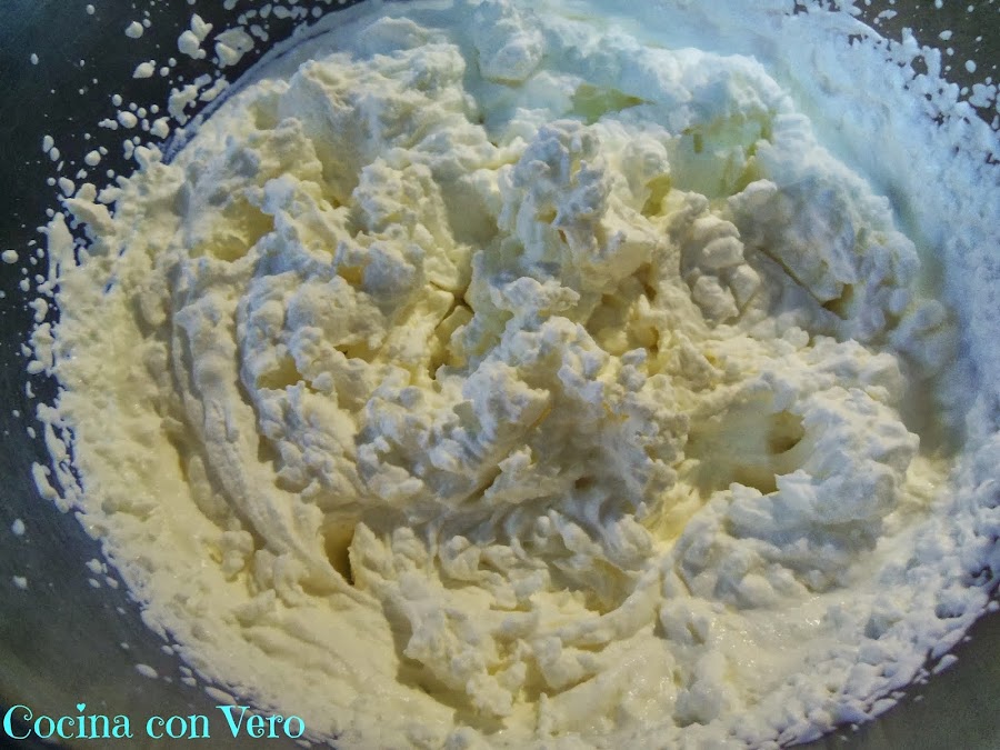 2/ A continuación, en un bol grande echamos la nata (crema de leche) y la batimos con las varillas hasta montar la nata (crema de leche).