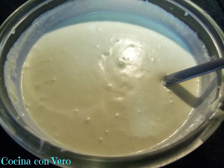 Una vez disuelto añadimos 150 gr. al bol de la nata (crema de leche) y reservamos el resto para la gelatina.