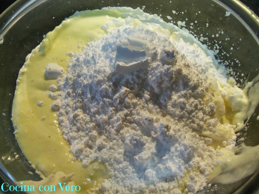 4/ Agregamos al bol de la nata (crema de leche) el zumo de los dos limones, la ralladura del limón, el queso de untar, el azúcar glass y lo mezclamos todo con una cuchara hasta que la mezcla nos quede suelta.