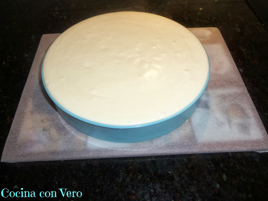 6/ Cuando tenga ya consistencia pasamos el cuchillo por alrededor de la tarta y con las dos manos vamos subiendo el molde de aro hacia arriba dejándolo por la mitad para que nos quepa la capa superior.