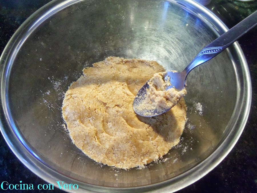 1/ En el bol de la picadora pasamos por tandas las galletas desmenuzándolas con las manos y triturándolas. Pasamos las galletas ya trituradas a un bol, añadimos la manteca y lo mezclamos con una cuchara hasta obtener una pasta homogénea y dura.