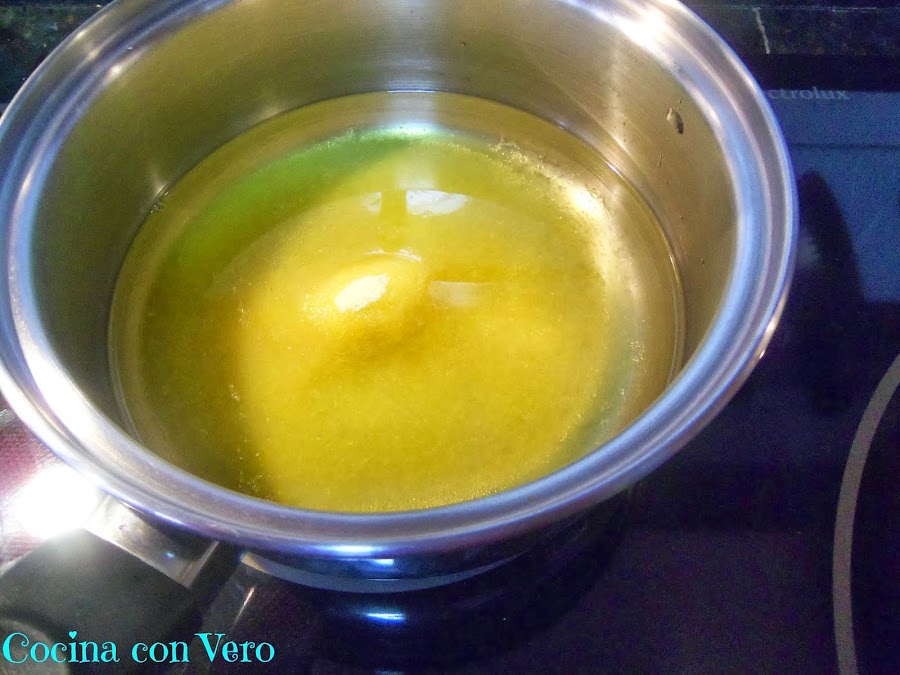 3/ En un cazo ponemos los 250 ml de agua muy caliente y el sobre de gelatina para que se vaya disolviendo sin que hierva revolviéndolo con una cuchara.