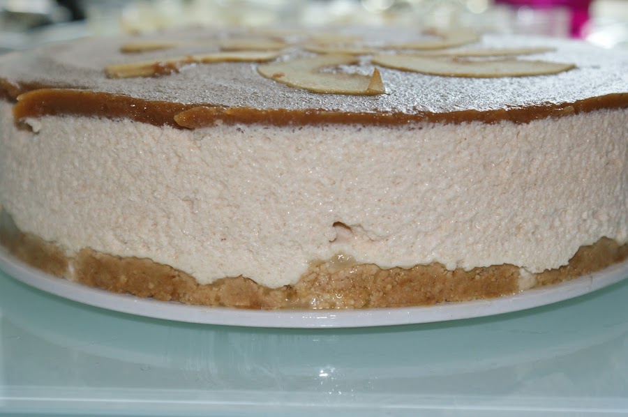 Calentar la leche y disolver en ella las hojas de gelatina. Reservar medio vaso de puré para la cobertura y mezclar la leche con el resto de puré de manzanas. . Mezclar con la nata (crema de leche) poco a poco. Verter encima de la base de galletas que habíamos preparado anteriormente.