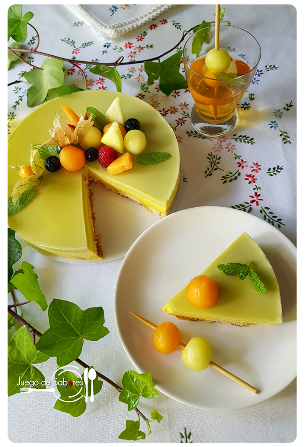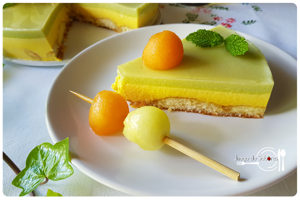 Digamos de entrada que esta tarta mousse de melón (o de melones porque hemos usado los de la variedades Galia y Cantaloup) no es difícil. Es entretenida. Requiere sus “tempos” pero el resultado es espectacular. Sobre una base de bizcochos de soletilla se van superponiendo las distintas capas de mousse de melón cada una de distinto color como bien se aprecia en el corte de la tarta. El toque final lo da la cobertura y la decoración que puede ser a base de bolas o triángulos de melón, frutos rojosA vuestra libre elección.
