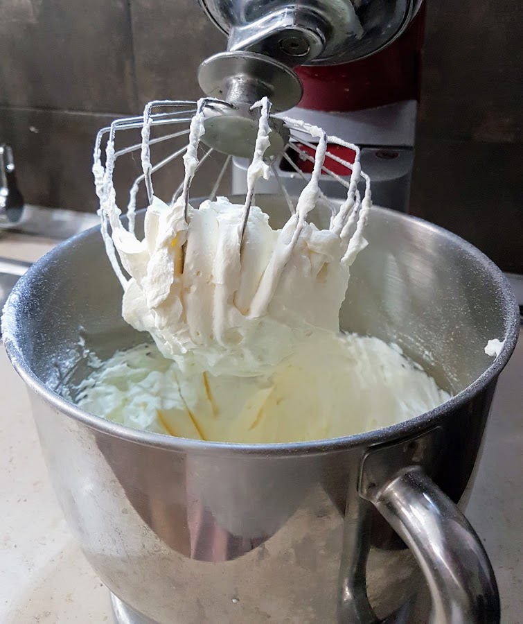 Una vez que la nata (crema de leche) esté bien montada añadimos el yogur y el zumo de naranja y mezclamos. S epude hacer con una espátula, mediante movimientos envolventes con cuidado de que la nata (crema de leche) no baje demasiado. En mi caso cedí el control a mi esclavo (mi Kmix), batiendo a velocidad baja hasta tener todo bien mezclado