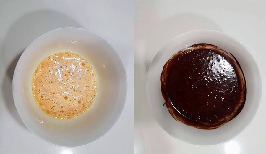 Por otro lado, batimos los huevos y el azúcar hasta que queden bien integrados. Añadimos el chocolate fundido despues de haberlo dejado templar unos minutos y mezclamos bien. Por último añadimos la harina, la levadura y la sal y removemos lo mínimo para que todos los ingredientes queden bien integrados