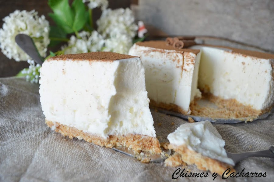 Ahora ir añadiendo la nata (crema de leche) poco a poco y mezclar con suavidad. Sacar el molde del frigo y verter la mezcla ,meter otra vez al frigorífico y dejar reposar de una día para otro. Desmoldar y quitar el papel de hornear, decorar con canela en polvo y a disfrutar.