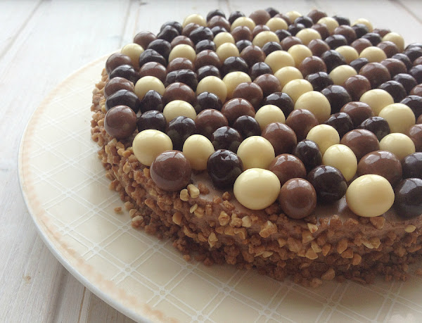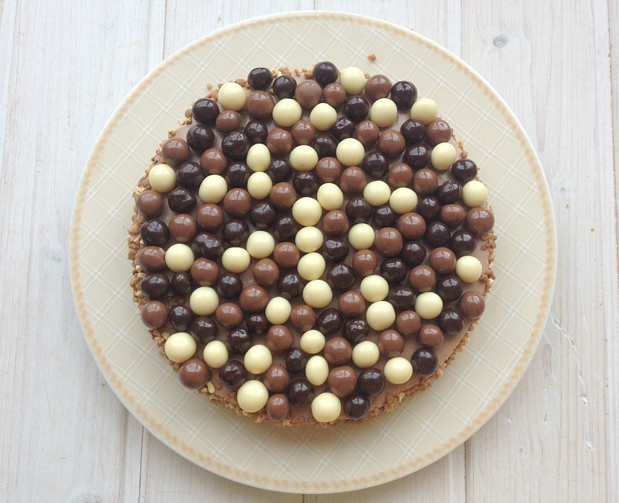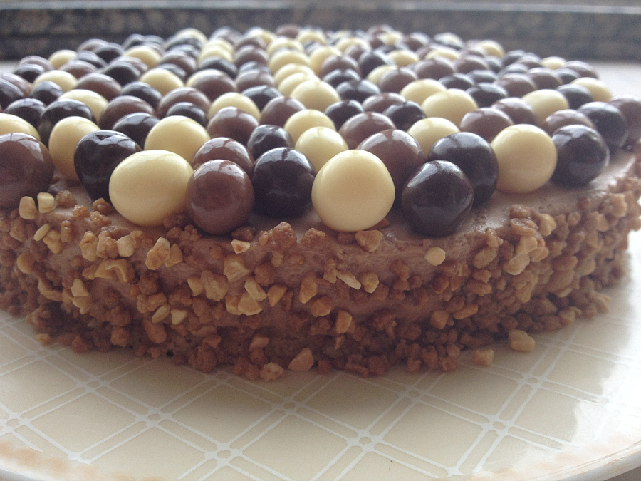 9. A la hora de servir, despegamos la mousse con ayuda de un cuchillo caliente (yo lo pongo un ratito en una taza con agua caliente) que pasaremos por los bordes del molde y decoramos a nuestro gusto. En este caso, utilicé granillo de almendra para los laterales y bolitas de galleta cubiertas de chocolate para la parte superior.