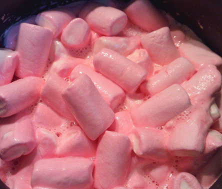 Al resultado de fundir las nubes le incorporaremos las dos hojas de gelatina, previamente escurridas. Y removeremos para que la gelatina se disuelva en la mezcla.