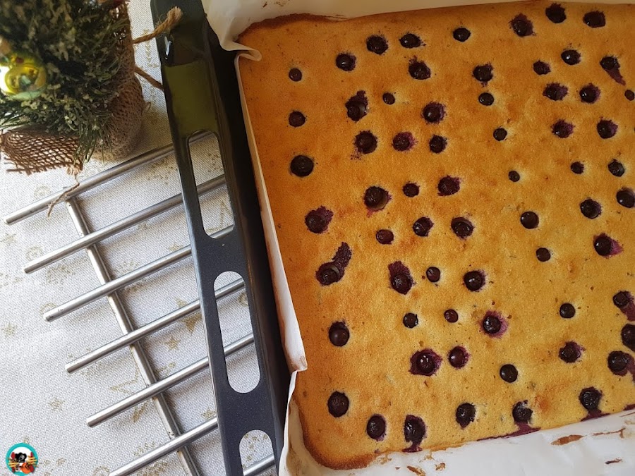 1.- Preparamos el bizcocho: (ver receta) Una vez este la masa en la placa, disponemos encima los arándanos azules. Horneamos el bizcocho de la tarta 12 minutos a 190º. Retiramos el bizcocho del horno. Dejamos que se enfrié dentro de la placa.