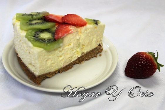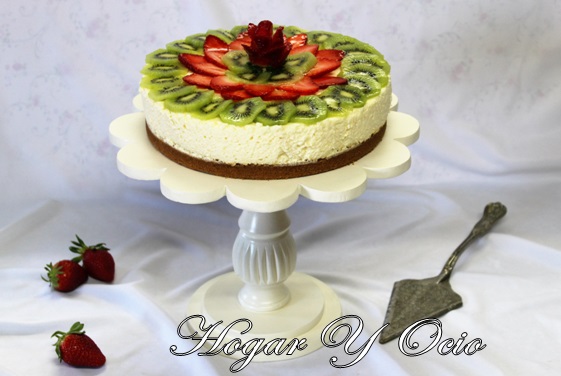 10. Desmoldamos la tarta y la decoramos con la fruta laminada (yo en el centro he intentado hacer una flor con la fresa, para ello tenéis que hacer pequeños cortes en la fresa, de fueta hacia dentro e intercalados, sin llegar a la base).