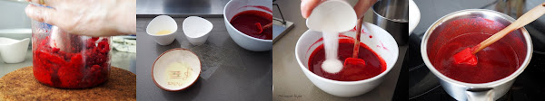 Con ayuda de una batidora triturar las frambuesas, pasarlas por un colador hasta conseguir un puré fino. Añadir y mezclar los azúcares y el zumo de limón.