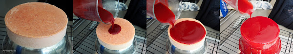 Desmoldar la mousse congelada y colocarla sobre un bol invertido. Verter el baño de frambuesa desde el centro hacia los lados, de manera que quede cubierta toda la superficie y también los laterales y escurra el sobrante. El contraste de temperaturas hará que la frambuesa gelatinice rápidamente.