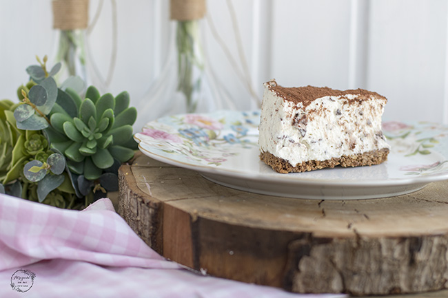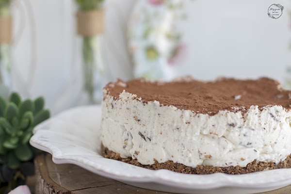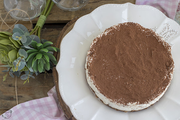 He visto esta tarta en muchos blogs, con unos ingredientes más o menos, pero en lo esencial siempre la misma, alguna con una cobertura de chocolate, aunque yo, con las prisas, le puse cacao en polvo, pero para darle color también le podemos poner frutos rojos por ejemplo.