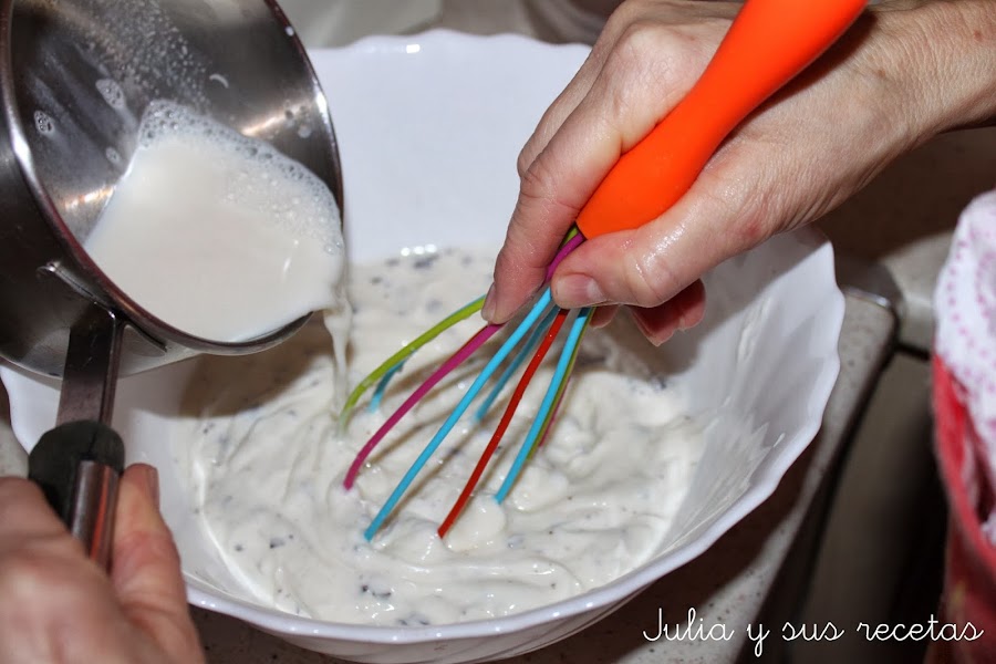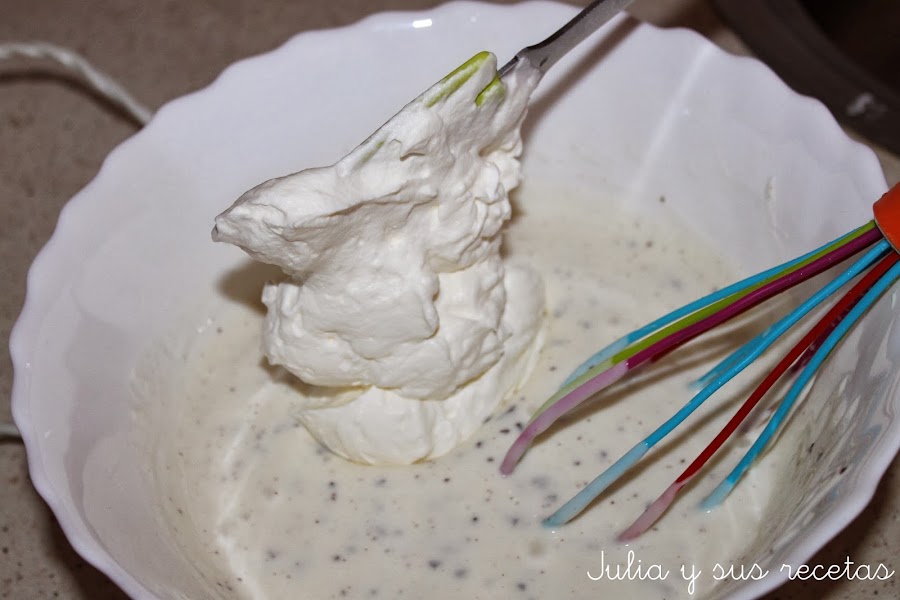 Añadimos la nata montada (crema de leche) y la mezclamos con movimientos envolventes.
