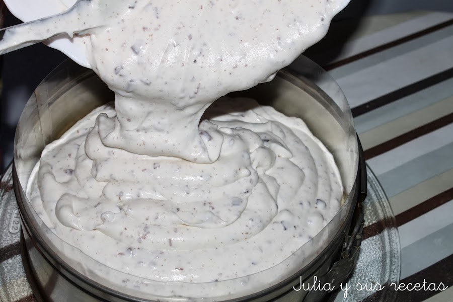 Lo colocamos en la bandeja donde vayamos a servirla, lo rodeamos con un aro de 22 cm (el de un molde desmontable).