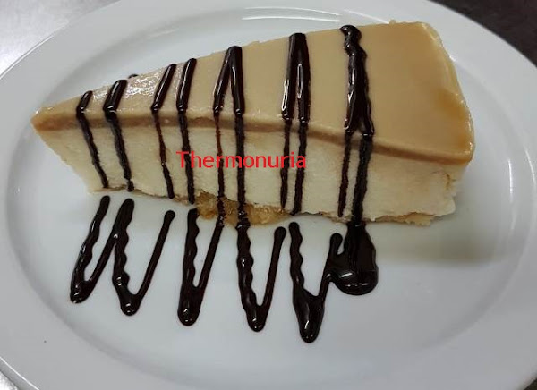 Si quieres cubrir toda la superficie de la tarta, hidrata una hoja de gelatina y cuando termine el tiempo de cocción de la salsa la añades al vaso y mezclas 15 segundos velocidad 5, esperas a que temple un poco y la viertes sobre la mousse ya cuajada y fría, sirve con un poco de sirope de chocolate o unos pompones de nata (crema de leche).