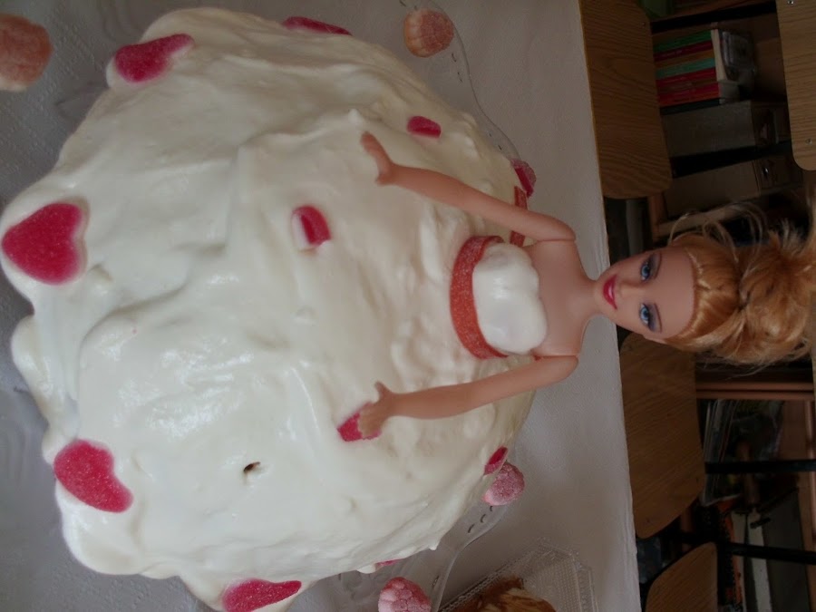 sobre la bandeja que vamos a servir y cubrir con nata montada (crema de leche) , ponemos en el centro una muñeca tipo barbi (yo la compre en un todo a cien le corte un poco las piernas ) y la clavamos en el centro, decoramos con gominolas de colores, segun nos guste