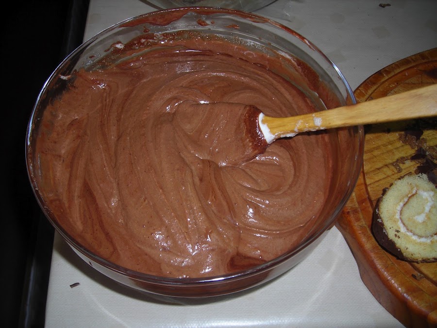 juntar el chocolate con la leche e incorporar a las claras.. con movimientos envolventes...con mucho cuidado igualmente.. incorporar la nata (crema de leche) y una vez todo bien integrado.. volcar sobre el cueco forrado de brazo de gitano... meter en la nevera unas horas.. tapado con papel de aluminio, una vez bien frio , solo tenemos que desmoldar.( mejor la hacemos de un dia para otro.).