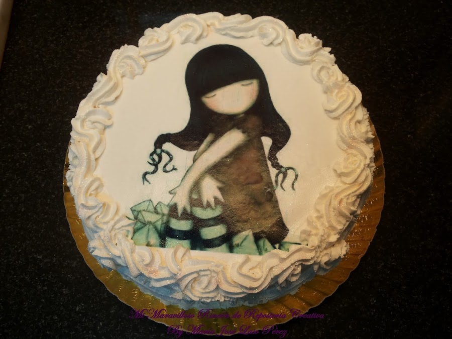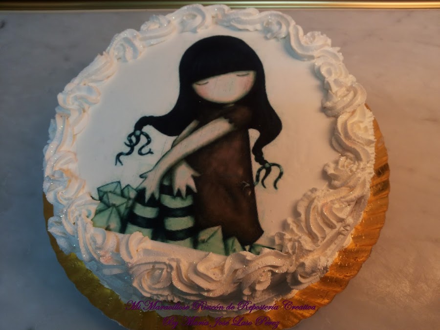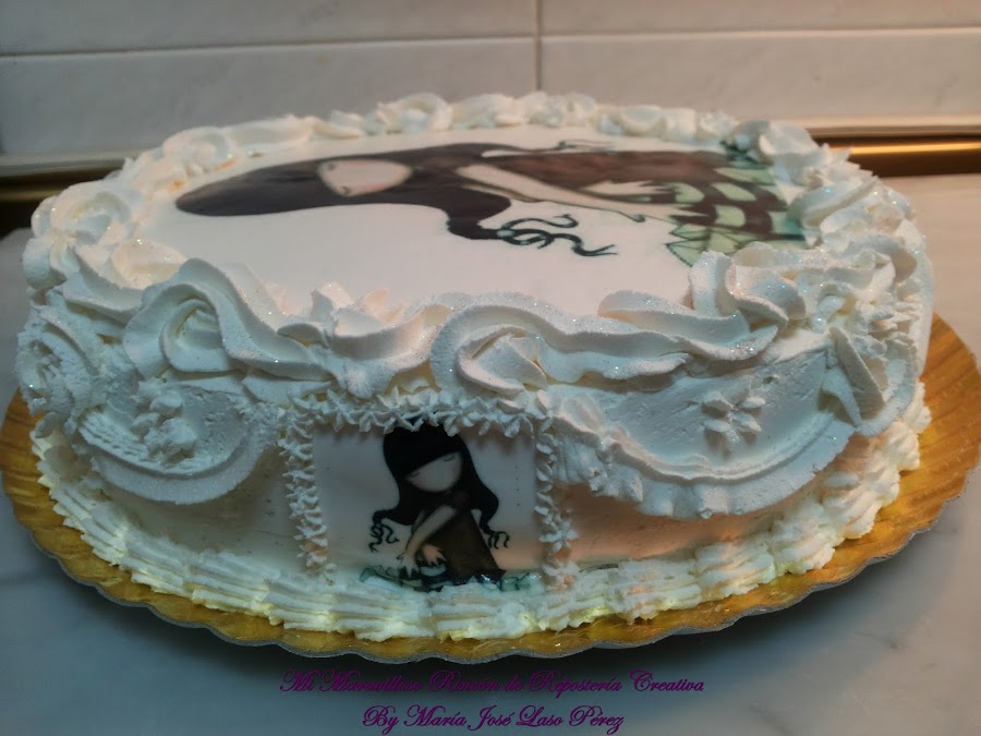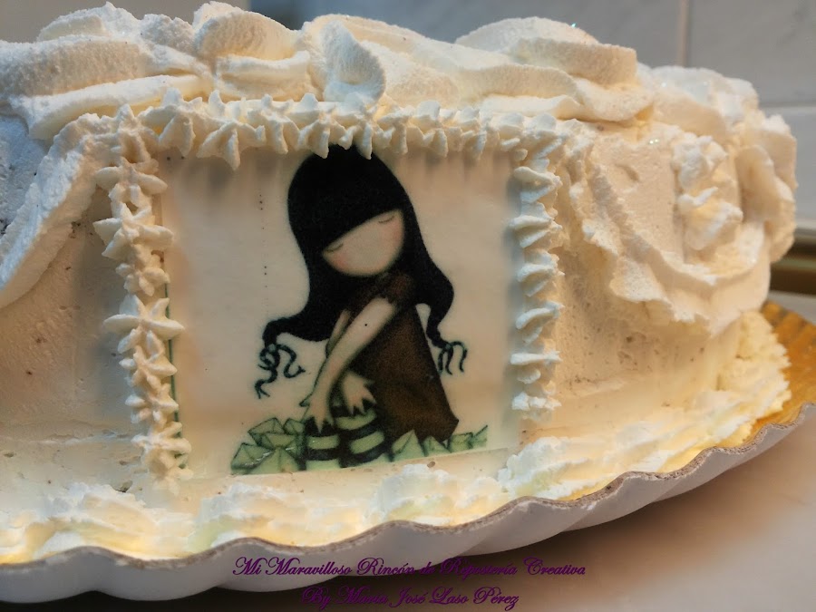 En esta ocasión el bizcocho era de chocolate, relleno de una nata (crema de leche) vegetal riquísima con sabor a chocolate blanco. El dibujo es una impresión comestible en papel de azúcar.