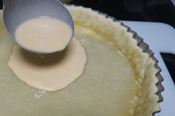 Cubrimos la masa con papel de horno, ponemos unos garbanzos y lo introducimos al horno a 180ºC durante 10 minutos. Cuando esté sacamos del horno y reservamos.