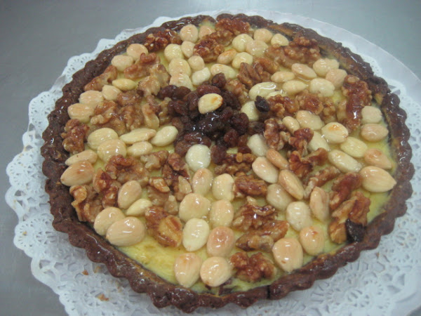 Montaje de la tarta:Cuando la crema esté templada verter sobre la superficie de la tarta, alisar y cocer 15 minutos en el horno a 180º C. Una vez cocida la tarta reservar. Repartir por la superficie de la crema los frutos secos de la forma que se desee y gratinar unos minutos en el horno para que los frutos secos se doren ligeramente. Una vez hecha, retirar del horno, dejar enfriar y abrillantar con un poco de almíbar o con un poco de mermelada de albaricoque muy diluida. Eso va en gustos