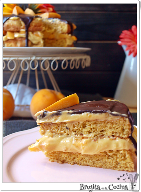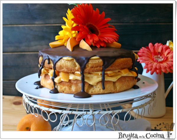 Cuando estén frios montamos la tarta con la crema y trocitos de melocoton.