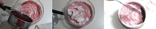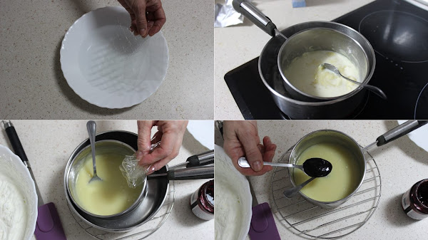 Cuando está casi fría la mezclamos con la nata montada (crema de leche) y por último le añadimos la clara montada. echamos la mousse encima de la mousse de frambuesa y la dejamos en la nevera unas 4 horas o hasta el día siguiente.