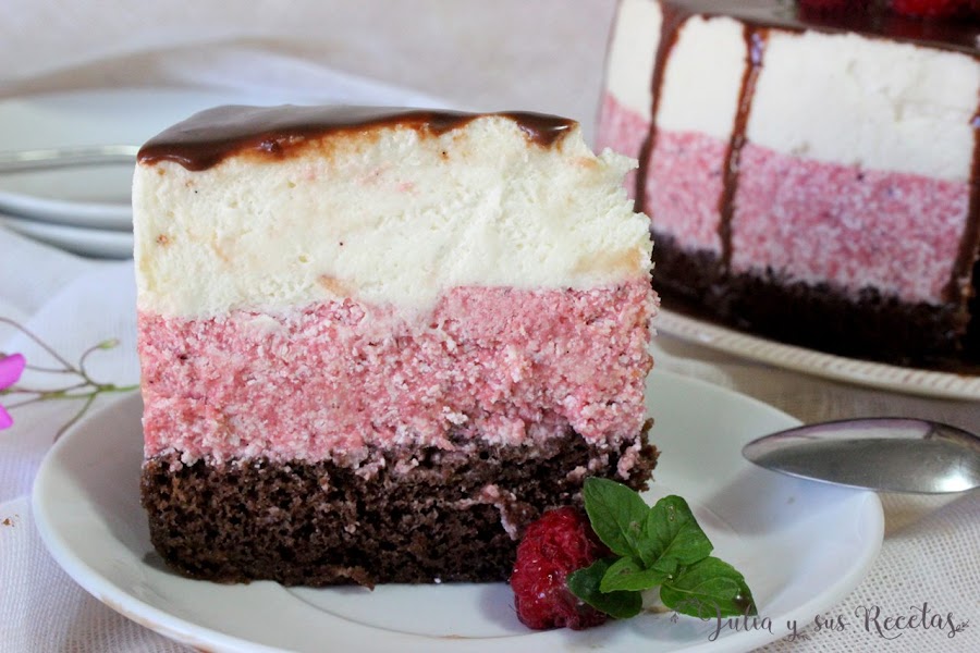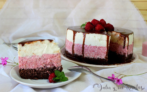 Bueno, pues mi versión es una tarta neapolitan mousse, es decir una tarta con bizcocho de chocolate y dos capas de mousse, una de frambuesas y otra de vainilla, una delicia para disfrutar mucho.