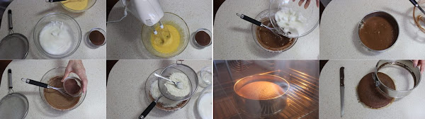 Hacemos el bizcocho:Separamos las claras de los huevos. Montamos las claras a punto de nieve. Batimos las yemas con el azúcar, añadimos el cacao en polvo y mezclamos, vamos añadiendo la harina tamizada con la levadura poco a poco y por último añadimos las claras montadas poco a poco con movimientos envolventes.