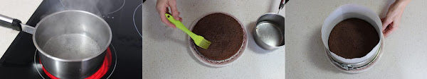Forramos las paredes del molde donde hemos hecho el bizcocho con papel de horno, más alto que el molde.y colocamos dentro el bizcocho frío. Podemos empaparlo con un almíbar ligero para que quede más jugoso.