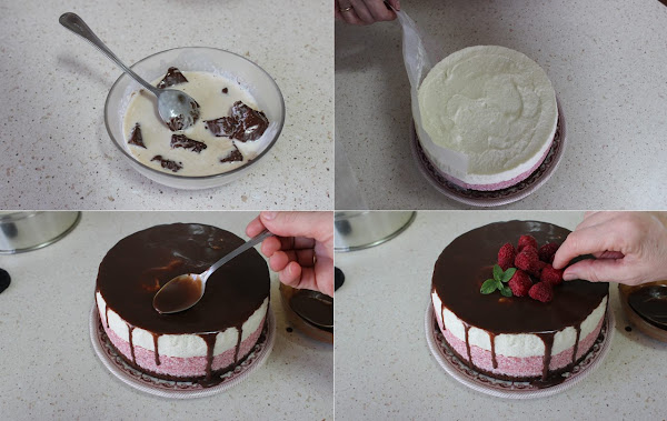 Sacamos la tarta del frigorífico,la desmoldamos y le ponemos la cobertura por encima y dejamos que caiga una poquita por los laterales. Le ponemos unas frambuesas encima y la dejamos enfriar del todo en el frigorífico.