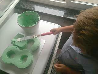 La tarta número es mas fácil de lo que parece en nuestro caso hacemos tres bizcochos, dos para el número 8 en círculos y uno para el número 5 en cuadrado, y luego recortamos dándole la forma.