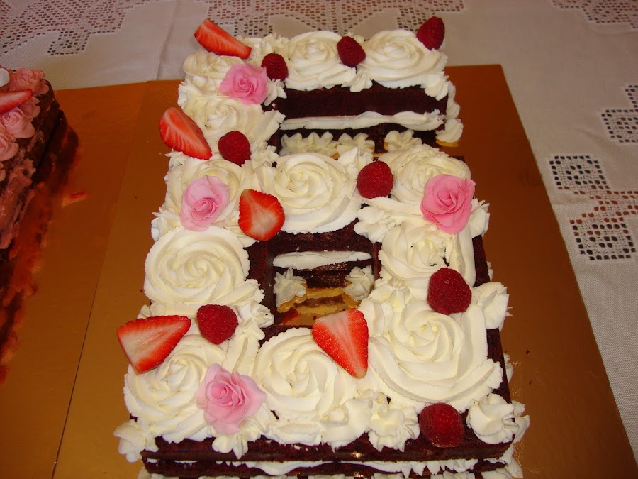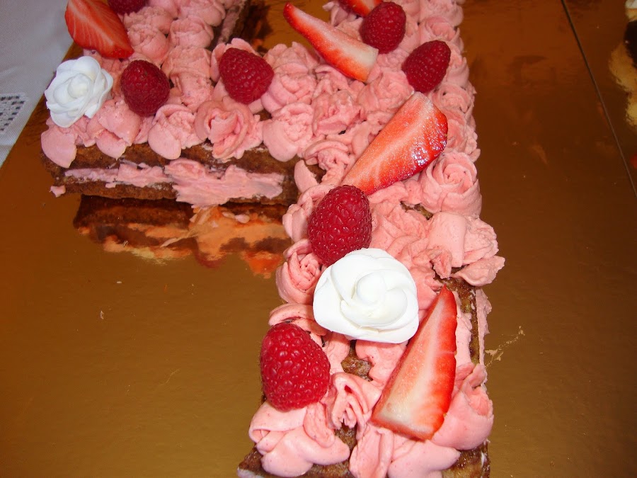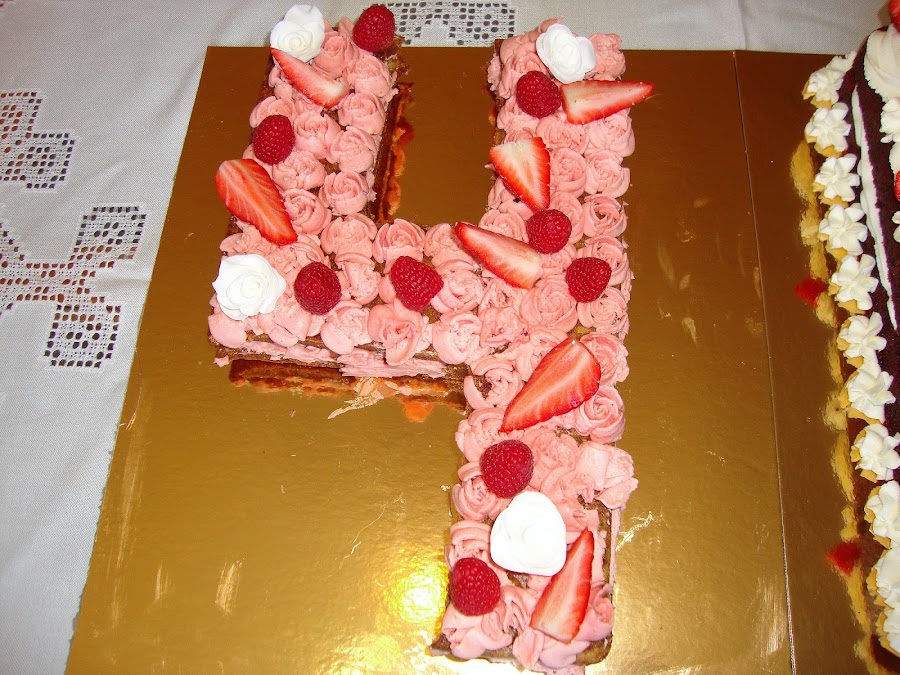 El número 4 está realizado con un bizcocho de vainilla relleno y cubierto de swiss meringue buttercream de fresa.