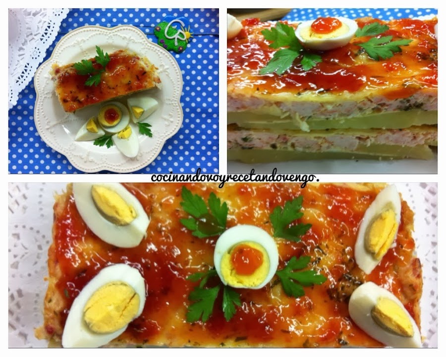 Cubrir todas las patatas (a mi me quedó muy poco grosor, ya que hice dos pasteles en molde cuadrados de tarta, pero si haceis uno os quedará mucho más alto)
