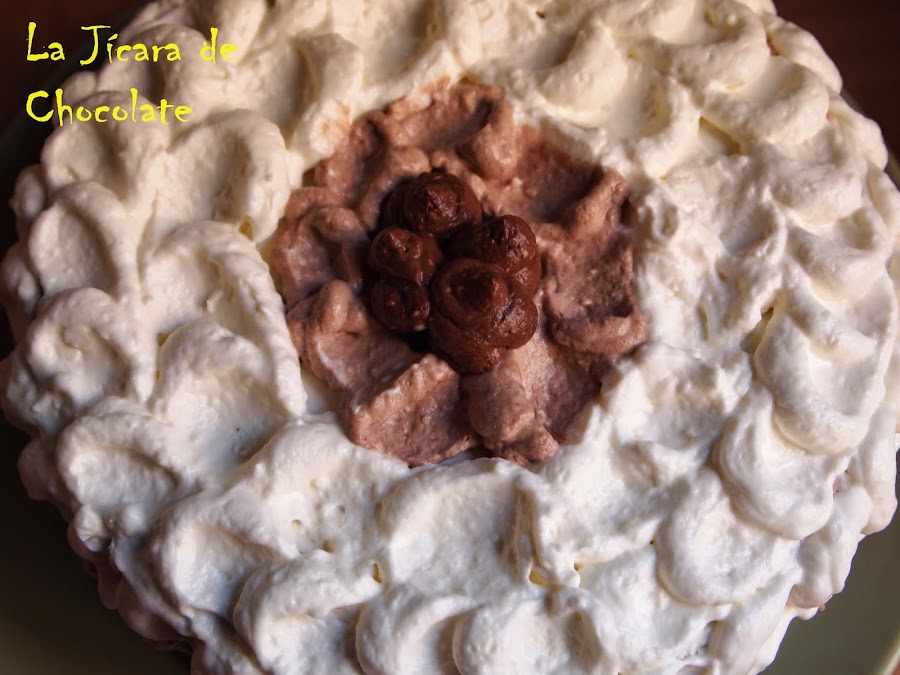33. Para decorar la parte superior de la tarta seguimos el mismo procedimiento. Yo hice dos filas de crema blanca, otras dos de crema de color intermedio y finalmente unos puntos con la crema oscura.