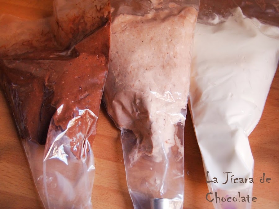 Para la decoración de la tarta necesitaremos tres mangas con tres boquillas lisas del mismo tamaño o lo más parecido posible.