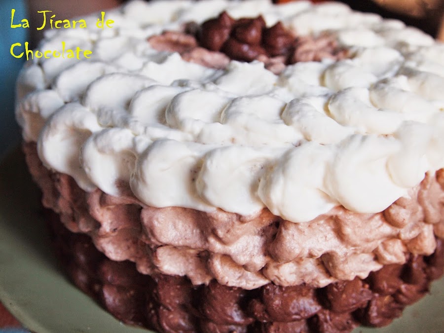 33. Para decorar la parte superior de la tarta seguimos el mismo procedimiento. Yo hice dos filas de crema blanca, otras dos de crema de color intermedio y finalmente unos puntos con la crema oscura.