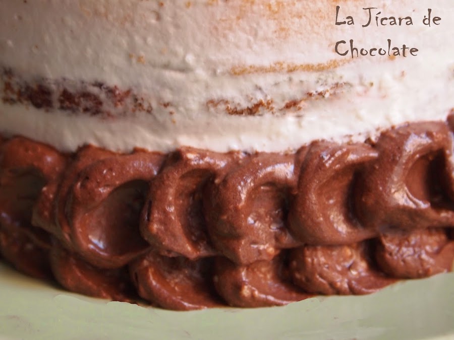 29. Sacamos de la nevera la crema más oscura. En la parte inferior de la tarta hacemos un punto grueso con la manga pastelera y con la parte trasera de una cucharilla, lo extendemos horizontalmente, como se puede ver en las fotos.
