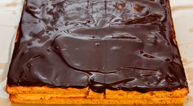De nuevo ponemos otra capa de pastel y remojamos con el jarabe. Untamos con la crema de mantequilla y añadimos otra capa de bizcocho. Volvemos a pincelar con el jarabe y agregamos la última capa de crema de mantequilla, también se puede poner otra capa de chocolate en lugar de tanta crema de mantequilla, eso ya a gusto de cada uno. En este momento reservamos la tarta en la nevera, mientras preparamos la cobertura de chocolate. Para ello lo más rápido es usar el microondas, ponemos el chocolate en el bol o plato pequeño y le vamos dando vueltas hasta que se derrita. Añadimos la mantequilla ya ablandada a temperatura ambiente o usando también el microondas unos segundos. Mezclamos bien hasta obtener una cobertura brillante, calentamos un cuchillo bajo el grifo de agua caliente y lo secamos. Entonces sacamos el pastel y vertemos la cobertura por encima ayudándonos del cuchillo templado para extenderlo bien. Esperamos 10 minutos mientras se enfría el chocolate a temperatura ambiente. Volvemos a sumergir el cuchillo bajo el grifo y lo secamos, para que esté templado. Cortamos los bordes del pastel para que quede perfecto, estos restos de tarta los aprovecharemos para darnos un gusto en el desayuno. Ahora es el momento de decorar el pastel con lo que se os ocurra, lo clásico es poner trocitos de oro comestible en láminas pero como es bastante caro os aconsejo bolitas de plata, flores comestibles, barquillos, etc, cosas que se pueden encontrar en cualquier supermercado y quedan muy bonitas. Ya podemos guardar nuestra tarta Opera en la nevera durante un par de días si fuera necesario, la sacaremos una hora antes de servir. Para cortarla en porciones, podéis usar el truco de climatizar el cuchillo ya veréis que se corta sin problemas.