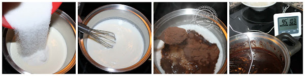 Mientras se enfría nuestra tarta, vamos preparando el glaseado de chocolate espejo para cubrirla. En un cazo vertemos la nata (crema de leche), el azúcar y el agua, mezclamos con las varillas hasta que rompa a hervir. Añadimos el cacao y seguimos mezclando con las varillas, cocemos a fuego medio hasta alcanzar los 103ºC, removiendo constantemente para que no se nos queme. Una vez alcanzada esta temperatura retiramos del fuego (es importante hacerlo con termómetro para que no se nos queme).