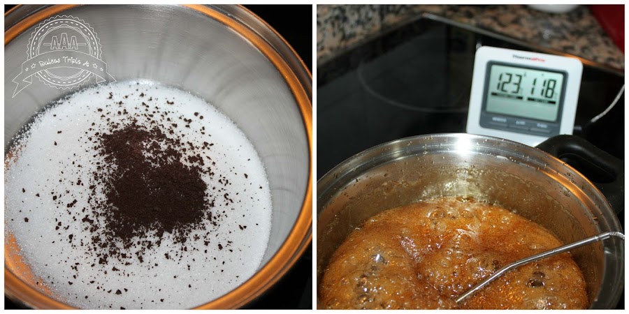 Preparamos la Crema Francesa de mantequilla con aroma a café, en un cazo al fuego incorporamos el azúcar, el café soluble al gusto y agua hasta cubrir el azúcar, la justa para cubrirla. Dejamos cocer hasta que alcance una temperatura de 118ºC-121ºC.